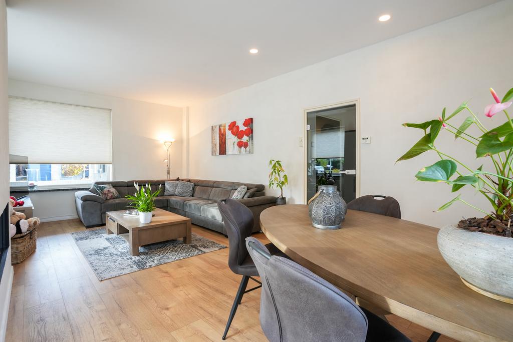Begane grond: ruime hal met leisteenvloer, garderobekast/bergkast en meterkast; toilet met fonteintje; woonkamer 7.48 x 4.00 met laminaatvloer, gezellige gashaard en openslaande deuren naar de patiotuin; gesloten keuken 3.40 x 2.76 met toegang naar de tuin en een moderne aanbouwkeuken voorzien van inductie-kookplaat (1 gaspit), afzuigkap, koelkast, vaatwasser en combioven.